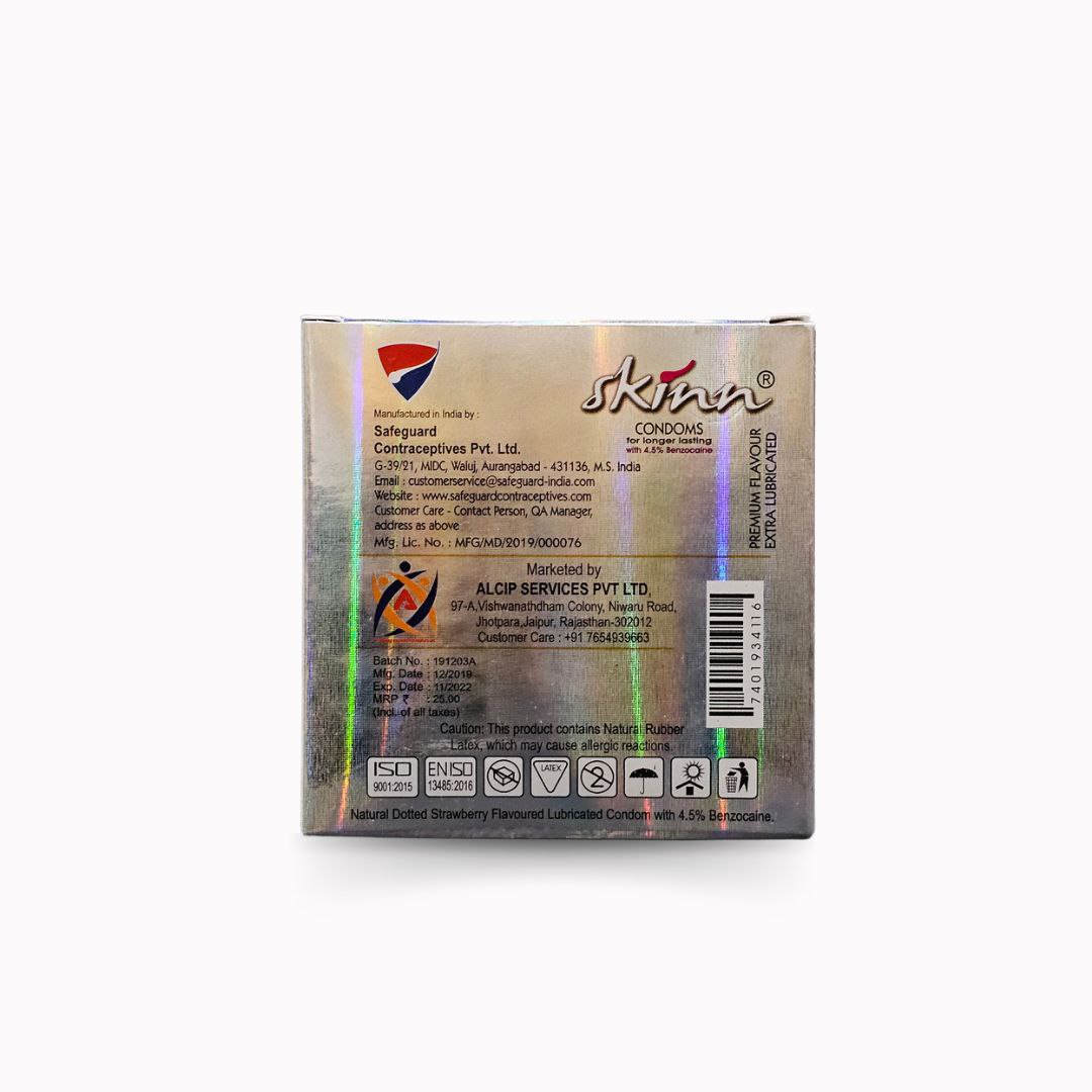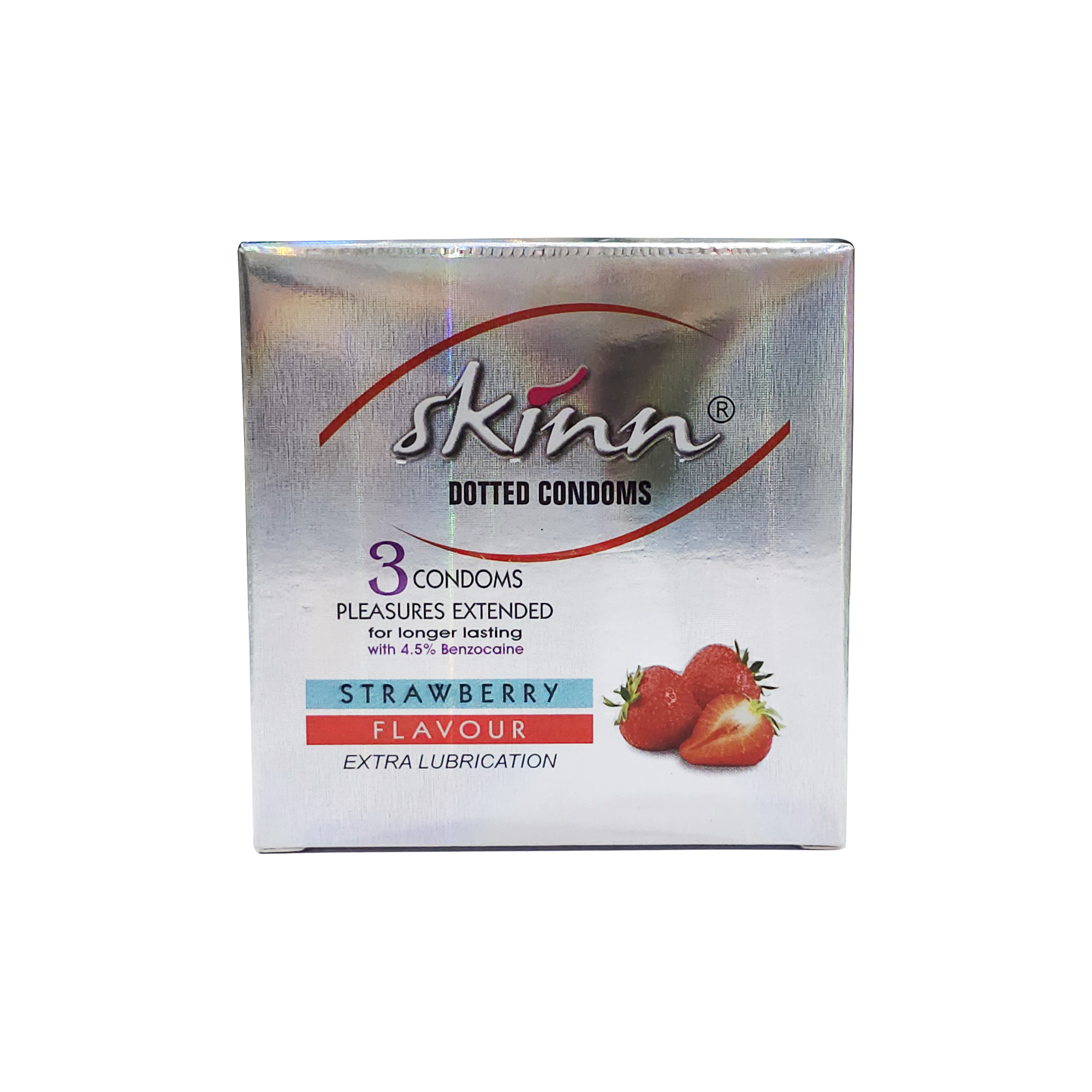 Experience enhanced pleasure and extended intimacy with Skinn Dotted Condoms. These condoms are designed with strategically placed dots for heightened sensation, while the addition of 4.5% Benzocaine offers longer-lasting pleasure.