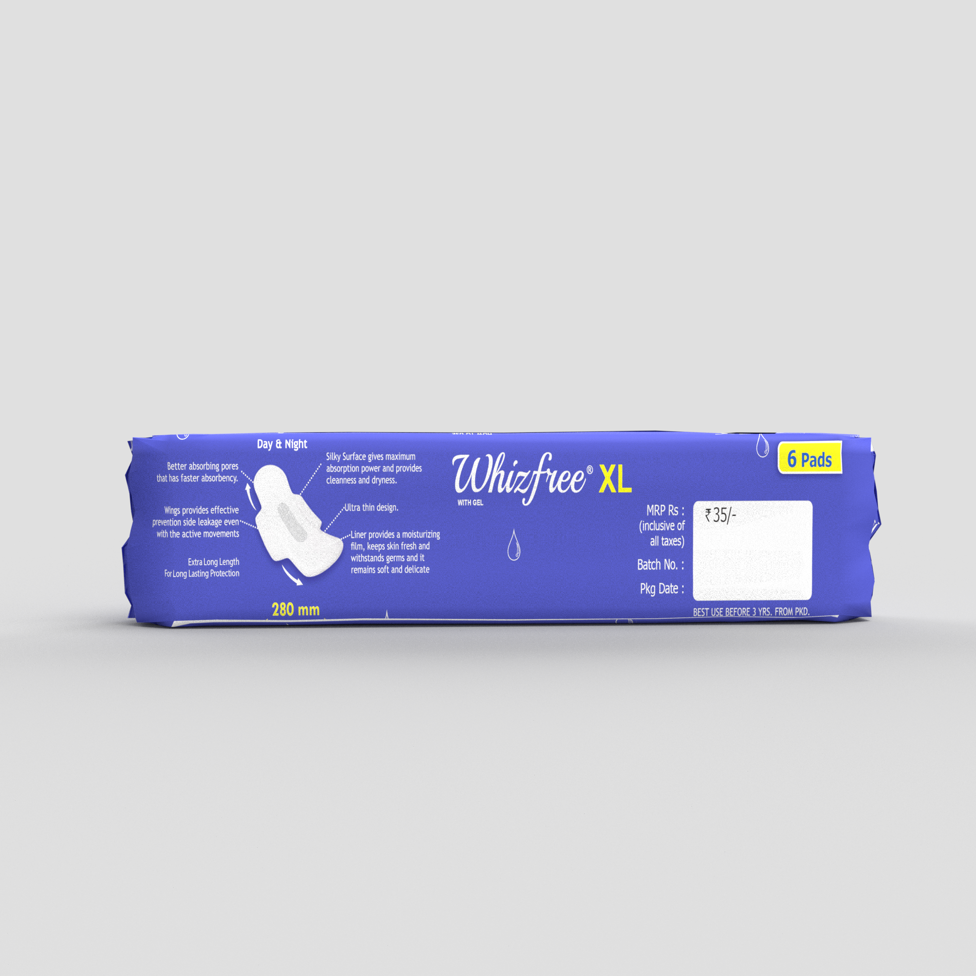 Embrace your period with confidence and comfort using Whizfree XL Advanced Sanitary Pads. Designed for heavy flow days, these pads offer superior protection and long-lasting dryness with our unique Leak Guard Technology and super absorbent gel. The extra-large size and wings provide a secure fit, keeping you feeling fresh and worry-free all day long.